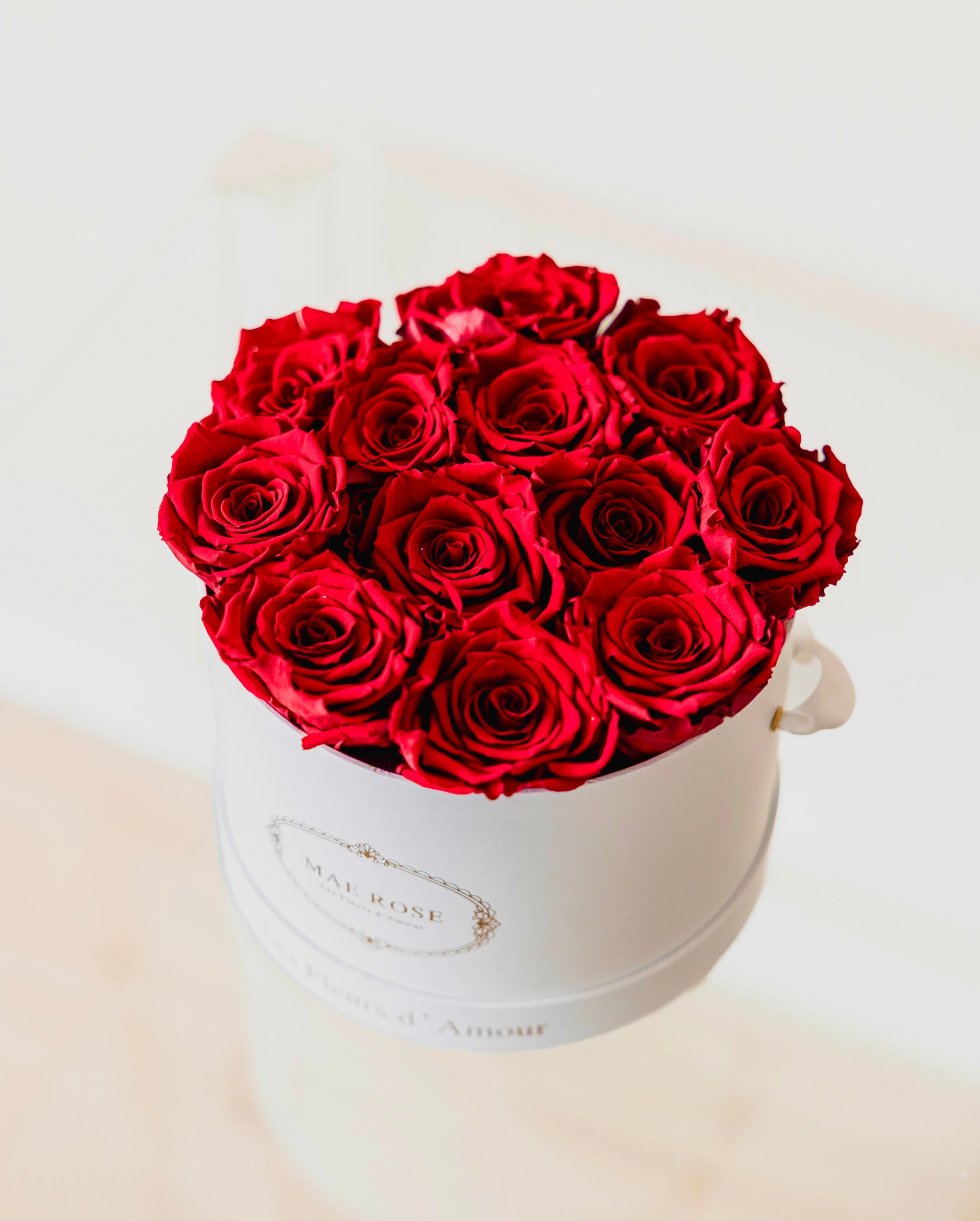 The Small Round brings timeless elegance to any room. Our roses are carefully treated to preserve their natural beauty for up to a year.